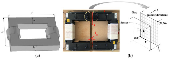 where , , t and are the amplitude, angular frequency, time and phase of the excitation voltage, respectively; N, R and is the number of turn, resistance and current for each coil, respectively; is the total magnetic flux in the core. Applying Ampere’s circuital law to the closed loop for the magnetic flux density in the core structure as shown in Figure 1b, the total magnetic flux in the loop of two U-shaped cores can be written as [19]