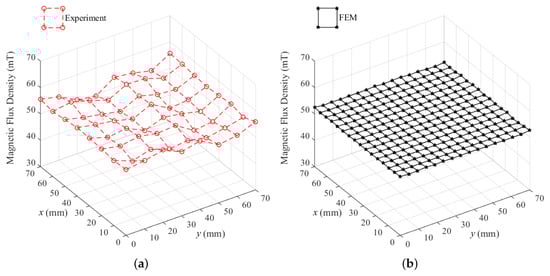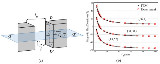 The (a) experimental; and (b) FEM distribution of the magnetic flux density as the gap distance is mm.