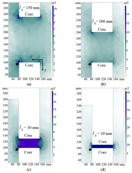 On the cross-section, it could be observed in Figure 4 that the mean magnetic flux density increases with the decrease of the gap. In a zy-plane within the air gap region between the two core end-faces, the cross-section of the magnetic field was also simulated for different gap distances. Using this approach, the leakage magnetic flux density distribution in the air on plane Q-Q’ in Figure 3a are shown in Figure 5. The driving voltage for all the cases is the same (35.89 V). It can be seen that the magnetic flux is more concentrated in the gap region (the rectangular region between the two U-shape cores) when the gap distance is reduced. As the gap increases, a large proportion of the magnetic flux escapes from the gap region and field is concentrated at the corners of the cut section. The fringing effect associated with the air gaps and the finite cross-section area of the core result in a higher magnetic flux density on the boundary of the cross-section than that flux density near the center of the core. This observation matches with previous analytical and experimental reports of fringing effects [20,21] and further validates the FEM in this paper accurately representing the physical system.