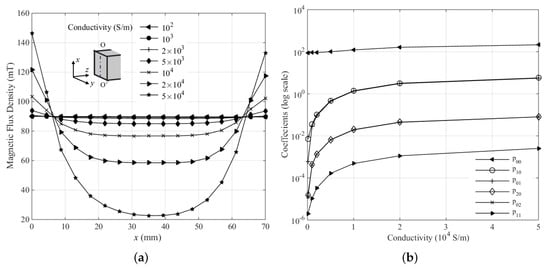 (a) The magnetic flux density distribution on median line O-O’ under different conductivity from S/m to S/m based on the FEM; (b) The variation of coefficients (log scale) in the empirical formula along with the conductivity.
