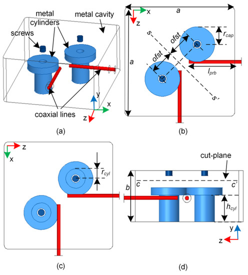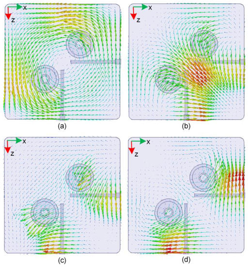 By examining electromagnetic field distributions of the resonant modes in Figure 2, it was observed that all four resonant modes were quasi-TM modes. The H-field distributions of all these modes are included in the Figure to provide understanding of the resonance. The field distributions were observed from the cut-plane c-c’ parallel to the xoz-plane, as is clearly graphed in Figure 1d. The first two resonant modes mainly affected by the two capped cylinders included quasi-TM01 and quasi-TM11 mode, which can be seen in Figure 2a,b, respectively. Besides these, there were other two modes—namely quasi-TM mode-3 and quasi-TM mode-4—with fields concentrating around the two probes, as clearly depicted in Figure 2c,d, respectively.