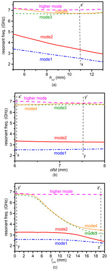 Mode-chart comprised of resonant frequencies of the first five resonant modes against different parameters of the filter: (a) resonant frequencies against height of the cylinders hcyl; (b) resonant frequencies against offset shift parameter ofst; (c) resonant frequencies against length of coupling probes lprb.