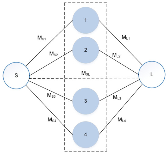 The transversal coupling topology was implemented to design the quadruple-mode filter [22], as depicted in Figure 4. The four shaded circles labeled as 1, 2, 3, and 4 represent the four resonant modes, while the two white circles on opposite sides represent the source and the load. The solid and dotted lines connecting resonators, source, and load show coupling and weak coupling among them, respectively. The mutual coupling among the four resonant modes was weak and could be neglected. The values of the coupling matrix were extracted using the extraction method explained in [23]. The coupling matrix explaining the filtering function is presented in (1).