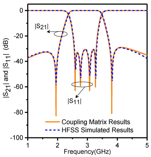 The filter responses acquired from HFSS simulations and the coupling matrix are compared in Figure 5 to validate the accordance of the simulation model with the coupling matrix. The results of the two models showed a good agreement between each other.