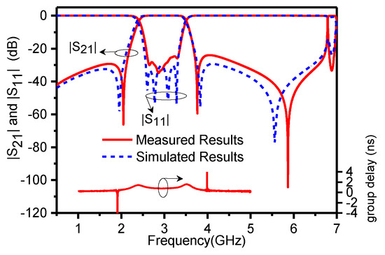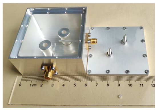 The filter was designed at 2.93 GHz with 38% wide fractional bandwidth. Figure 8 shows that the simulated and measured S-parameters of the filter agreed well with a small deviation probably caused by loss of the aluminum material used and tolerance in the fabrication of the cavity, cylinders, and probes. It was noticed that the tips of the input/output probes were slightly bent away from the mushroom-shaped cylinders, which was believed to be the main cause for the small deviation between simulated and measured results. The deviation could be minimized by selecting materials with low loss and improving the fabrication process, especially the probes. The measured insertion loss at the center frequency was 0.06 dB, and the measured return loss for the wide passband was better than 25 dB. The measured group delay showed considerable linearity along the wider passband of the filter. A prototype filter was fabricated using aluminum to validate the simulated results of the filter, as clearly photographed in Figure 9.