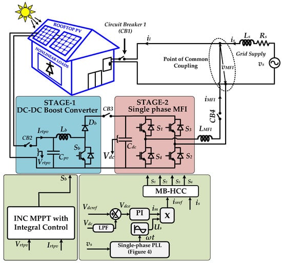 In this section, the detailed schematic of the RTSPV integration system configuration for LVDS applications is illustrated in Figure 1. The RTSPV system is connected in parallel to the LVDS at the point of common coupling (PCC). The single-phase system is modeled as an ideal AC voltage source in series with the source impedance, and it is connected to the nonlinear loads as depicted in Figure 1. The key building blocks of the RTSPV system are the two-stage power circuit and the MB-HCC architecture. The two-stage power circuit consists of an INC-based MPPT-controlled DC-DC boost converter coupled with a current controlled voltage source inverter (VSI) as MFI with RTSPV interfacing.