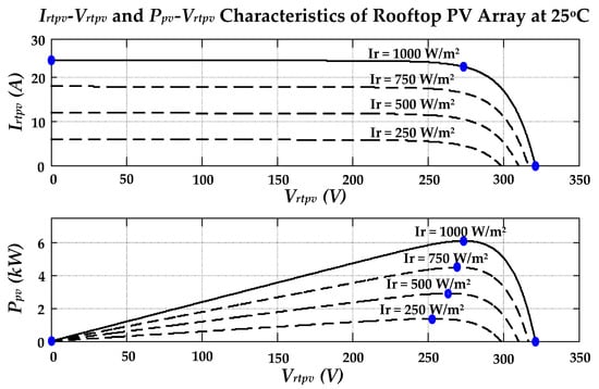 The shade-free rooftop space required for the SPV installation is considered as 732 sq.ft as per the design procedures []. While building the SPV array using a MATLAB/Simulink environment, five series and four parallel SUN POWER SPR-305 WHT PV [] modules were considered to build the PV array, which is capable of generating the 6.1 kWp power using MPPT-controlled DC-DC boost converter. The Irtpv-Vrtpv and Prtpv-Vrtpv characteristics of the RTSPV array concerning the variation of solar irradiation are depicted in Figure 2.