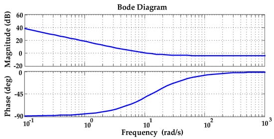 where the kp and ki gain values are obtained by using the Ziegler-Nichols second method [,]. Initially, the kp gain value was set by the Ziegler–Nichols second method table value as 0.6, then the tuning procedure was continued by the proportional-integral-derivative (PID) controller autotuning in the MATLAB/Simulink environment to obtain the ki value for improved performance. After successful tuning using the PID auto-tuning procedure in the MATLAB/Simulink environment, the ki gain value was obtained as 10. The main objective of this tuning is for attaining the lowest percentage total harmonic distortion (THD) of the grid current which is within the limits of IEEE 519-2014 and IEEE 1547 standards, respectively [,]. The PI controller gains of the DC-link voltage loop were tuned for a low crossover of the frequency range, i.e., in between 10 Hz to 20 Hz, to attenuate the high-magnitude ripple content in MFI DC-link voltage. The Bode plot of the tuned PI controller with the obtained gain values of the MFI DC-link voltage control loop which regulated the DC-link voltage and reduced the steady-state error is depicted in Figure 3.