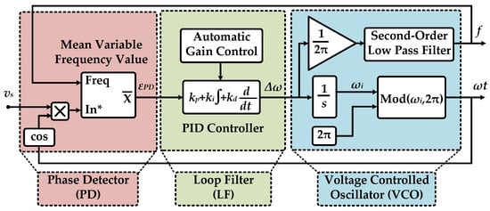 The unit vector (Us) is generated by using the grid synchronizing angle (), which is obtained from a phase-locked loop (PLL) [,,]. The PLL used in the MFI control under both ideal and distorted grid conditions is illustrated in Figure 4. The PLL parameters selected in the MATLAB/Simulink 2013 environment for both simulation and RT implementation are tabulated in Table 3. The main objective of this PLL was to obtain the synchronization angle accurately under ideal and distorted grid conditions, in order to generate the sine unit vector template (Us). The peak value of the source current (im) was multiplied by the Us to generate the source current reference (isref) in phase with source voltage at unity power factor. To purge the harmonics and reactive power under ideal and distorted grid conditions, it was necessary to force the source current to maintain a sinusoidal nature, and it should be in phase with the source voltage. The sine unit vector template and reference source current expressions under ideal and distorted grid conditions are given as follows: