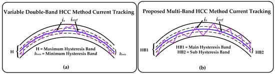 In the MB-HCC method, the ranges of the two hysteresis bands are adjusted based on the reference current (isref) and their scaling factors (h1 and h2), whereas in the VDB-HCC method, the hysteresis band is determined by using Equation (11). The simple switching logic of the MB-HCC method is as follows: