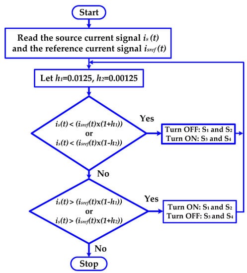 In this proposed MB-HCC method, two hysteresis bands are derived based on the scaling factors approach. This method controls the MFI switches in such a way that it can force the actual source current (is) to rise and fall and closely tracks reference current (isref) between the main and sub hysteresis bands (HB1 and HB2) as depicted in Figure 5b. The detailed flowchart of the MB-HCC algorithm is illustrated in Figure 6. The switching pulses are generated through tracking current response between dual hysteresis bands (HB1 and HB2). In contrast to the VDB-HCC method, the MB-HCC method balances the switching frequency based on the current tracking uniformly, as shown in Figure 5b.