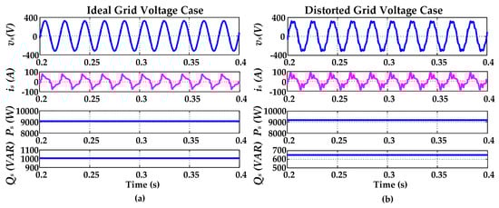The percentage of THD of the source current under a distorted grid condition was 42.69%. The active and reactive power profiles at PCC under the distorted grid condition is depicted in Figure 7b. The active power consumed from the grid under a distorted grid condition was 9.331 kW as described in Figure 7b. The reactive power under a distorted grid case was 0.655 kVAR. In both cases, the harmonics and reactive power were deteriorating the LVDS power quality. Therefore, it is necessary to compensate for the harmonics and reactive power to improve the operating efficiency and reliability of the LVDS under both ideal and distorted grid conditions.