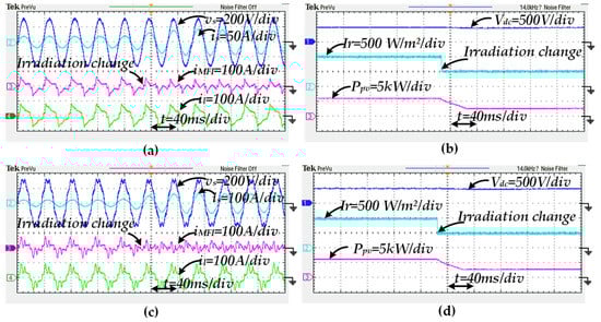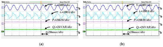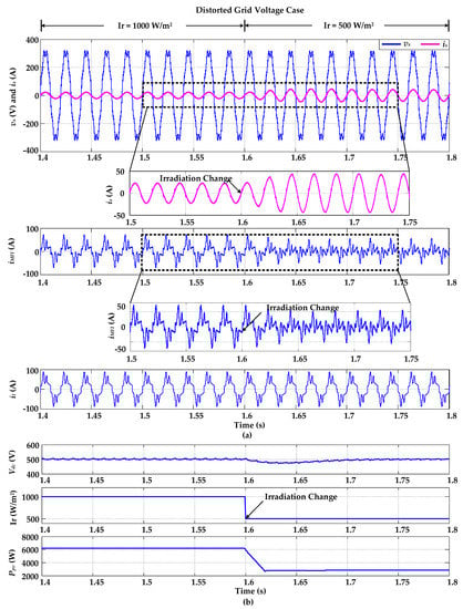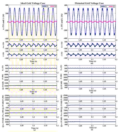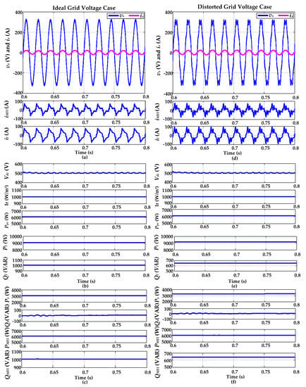 In Figure 8d the source voltage and current responses after compensation of harmonics and reactive power, under the distorted grid voltage condition, are represented along with MFI and load currents. Here, the source current was transformed to sinusoidal and in-phase with the source voltage, irrespective of the load current nature, with the help of the MFI current. The inverter DC-link and RTSPV generation at an irradiation level of 1000 W/m2 is depicted in Figure 8e, where the DC-link was stable at 500 V, and the RTSPV power was 6 kW. In addition to that, the load active and reactive power profiles under distorted grid conditions are also illustrated in Figure 8e. The source reactive power was also reduced close to zero by injecting the required reactive power, as shown in Figure 8f.