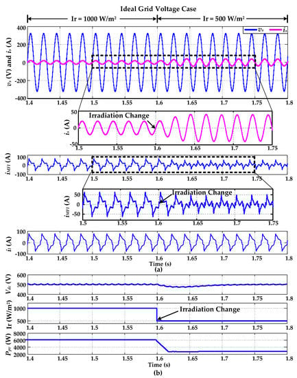 The source voltage and current responses after compensation of harmonics and reactive power under the ideal grid condition are depicted in Figure 8a along with MFI and load currents. From these results, it is observed that the source current harmonics were compensated, and it was in-phase with the source voltage. Thus, the power conditioning task is achieved effectively. Moreover, grid consumption was also minimized simultaneously. The detailed response of RTSPV power generation at irradiation of 1000 W/m2 and the DC-link voltage responses are presented in Figure 8b. These results confirm that the DC-link voltage is maintained stably at a rated value of 500 V. The load active and reactive power profiles are also illustrated in Figure 8b. The grid sharing response is depicted in Figure 8c; from this, the source power consumption was reduced, which was owing to the active power feeding from the MFI. The MFI also supplied the necessary reactive power to reduce the source side reactive power close to zero, as shown in Figure 8c.