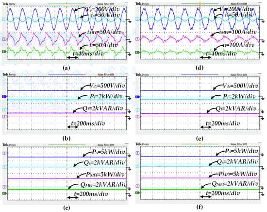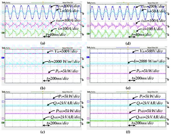 Simulated output waveforms under MFI ON, grid sharing, and power conditioning mode. (a) Ideal grid input voltage, current, MFI current, and load current; (b) MFI DC-link voltage, solar irradiation, PV power, and load active and reactive power under ideal grid; (c) source active power, reactive power, and MFI active and reactive power under ideal grid; (d) distorted grid input voltage, current, MFI current, and load current; (e) MFI DC-link voltage, solar irradiation, PV power load, and active and reactive power under distorted grid; (f) source active power, reactive power, and MFI active and reactive power under distorted grid.
