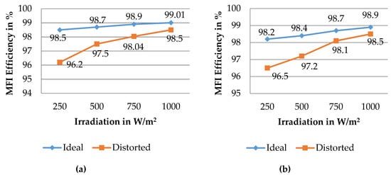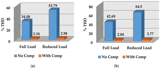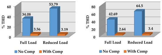 The %THD at PCC during no compensation and with MFI compensation cases under ideal and distorted grid voltage conditions using the VDB-HCC method [] is illustrated in Figure 19. The %THD was brought down from 34.08% to 3.56% under the ideal voltage condition at full load. For the reduced load case, it as reduced from 53.79% to 3.19%. In a distorted grid voltage condition, the %THD was reduced from 42.69% to 2.64% at full load case. In the reduced load case, the %THD was minimized from 64.5% to 3.4%.