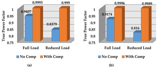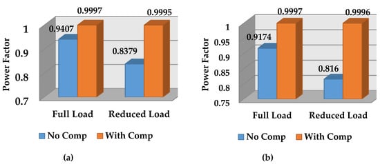 The true power factor (TPF) at PCC before and after compensation of reactive power, under ideal and distorted grid voltage conditions, using the VDB-HCC [] method is described in Figure 21. Under the ideal grid voltage condition, the TPF was improved from 0.9407 to 0.9993 at full load, whereas in the half load case it was improved from 0.8379 to 0.9990. In a distorted grid condition, the TPF was enhanced from 0.9174 to 0.9996 at full load. In the reduced load case, the TPF was enhanced from 0.816 to 0.9989. The power factor (PF) at PCC before and after compensation of reactive power, under ideal and distorted grid voltage conditions, using the MB-HCC method, are described in Figure 22.