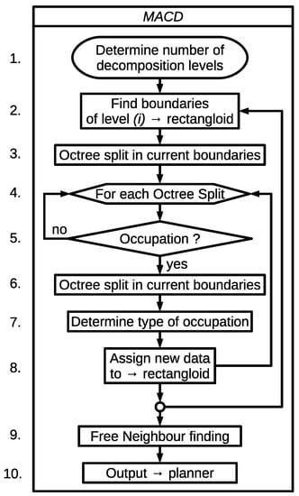 The procedure is summarised in the flowchart shown in Figure 2, beginning with a specification of the number of decomposition levels. For the first level (), search limits are set to the environmental dimensions . Partition of the octree divides the environment in 8 equal parts in relation to the previous boundaries. In every single octree, an obstacle search is performed that determines the possibility of a later decomposition. Once this level decomposition is finished, the complete information of and space is completed. Finally, a planner determines the best trajectory in distance terms.