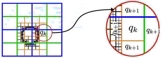 Figure 3 shows an example of a quadtree decomposition, denoted by with current level , with reference to its own neighbourhood. On its left side, there are neighbours with smaller dimensional characteristics than the present . There is a total of 8 neighbours, from with , of which only 8 are related directly with the neighbourhood. The lower and upper face of has the same level of decomposition, being and producing a single neighbour. On its right side, as the dimensions of the neighbour are larger than , the number of neighbours is equal to 1, counting a total of 11 neighbours and possible movements in this case.