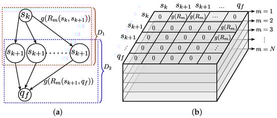 - is the received reward associated with a priority for executing an action on a function and is stated as the sum of two transition priority vectors and defined as:Hence, the best reward value from vector D generates the best x—and the final path, denoted by , defines a finite labeled graph with vertex .