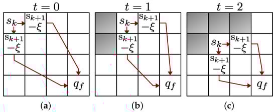 To explain the methodology, and for sake of simplicity, let’s state the problem of travelling from the actual state or point to the point in a environment using a standard cell decomposition. Figure 6a shows the initial scenario as well as the different states (observable and neighbours) that may become a new . In this case, in , it is the same cost to move right or down—this situation appears due to the inherent symmetry of the decomposition methodology. In such a situation, randomness decides the next state.