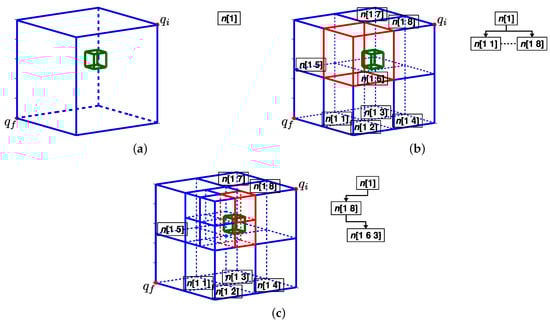 Figure 7a shows the environment definition (blue lines) as the main node with an obstacle placed inside (box green lines). Once the first decomposition is performed (Figure 7b), a first octal level is generated with nodes having different occupancy properties. Each will belong to if there is no within its voxel limits () (blue lines), or to if the voxel is partial or totally occupied by the obstacle (red lines).