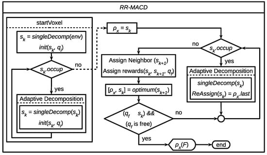 The procedure is split in two stages. Firstly, a start voxel location is defined and, if there is an in the environment, an initial simple decomposition singleDecomp is performed (as a result, the collision-free voxel that contains the point will be defined). Once the initial state is assigned—which is also an initial —the procedure proceeds depending on its occupation. If is collision-free, the neighbours are assigned, the rewards are calculated, and the optimal x is located. Therefore, the best state x becomes the new and is added to . If this new is occupied, the process requires another decomposition on the current , and will return to its previous state. The procedure is completed when the current contains the point and is collision-free.