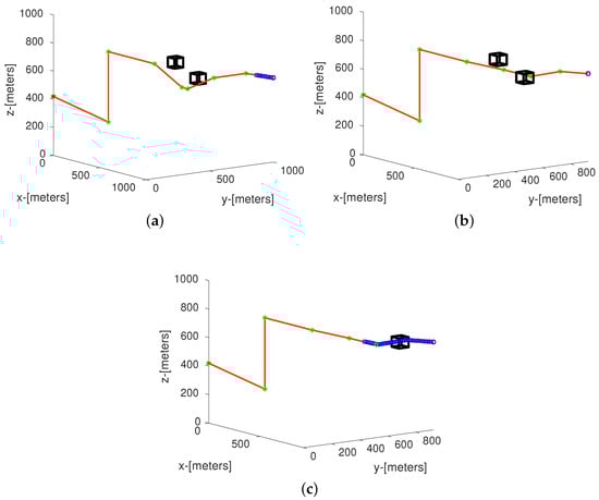 Figure 11 represents this new environment with two obstacles in motion (black boxes). The first dynamic obstacle begins its displacement in location (600, 600, 600)m, and performs a continuous motion in an direction with a constant velocity of 15 m/s. The second one begins its flight in location (80, 800, 600)m with a constant velocity of 15 m/s in the same direction. After 11 s, the first obstacle collides with (this crash is illustrated with orange line in Figure 11a) and a new is calculated, Figure 11b shows the new location of the obstacles (notice that limits in x and y axis have changed from 1000 m to 800 m). At 34 s, a new collision is detected (Figure 11c), even though the first obstacle is out of the environment, the second one has collided with . When the UAV (blue square) has passed this part of , the new trajectory until is collision-free.