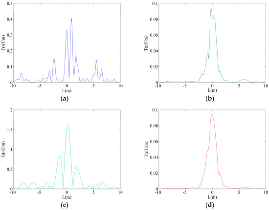 Figure 4 illustrates a defect on the pipeline upper surface locating the coordinate original, with length a of 0.1 m, width b of 0.3 m, depth c of 0.003 m. The magnetic susceptibility . The measurement length is 2L = 20 m, and the sampling interval is o = 0.1 m. The distance between the sensor to ground is h1 = 0.5 m, the distance between ground to pipeline upper surface is h2 = 1 m. The geomagnetic field intensity is H = 43.56 A/m, the magnetic declination is , and the magnetic inclination is .