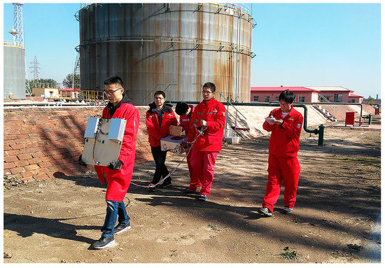 Figure 7 shows a field-testing process for the buried pipeline. The measurement system contained high-precision magnetic TMR2309 sensors (with a measurement range of ±10 Oe and a sensitivity of 100 mV/V/Oe), an ADLINK USB-1901 data acquisition card (with a resolution of 16-Bits and a sampling rate of 250 kS/s), an industrial personal computer, and GPS. The segment pipeline was made from Q235 steel with a diameter of 323 mm, a wall thickness of 5 mm, a buried depth of 1 m, and an operating pressure of 2.5 Mpa. It was put into production in Hebei Province, China.