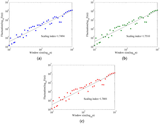 The scaling index of four denoising methods. (a) Conventional CEEMDAN denoising 1. (b) Conventional CEEMDAN denoising 2. (c) ICEEMDAN denoising.
