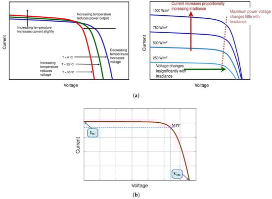 The output voltage and current variations during irradiation and temperature changes. (a) PV module voltage-current graphs versus solar irradiance and temperature; (b) Maximum power point of a PV module.