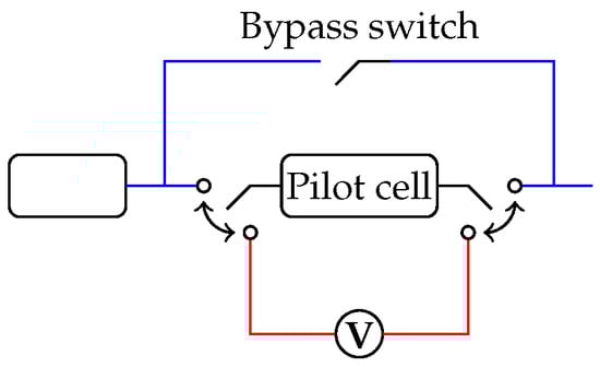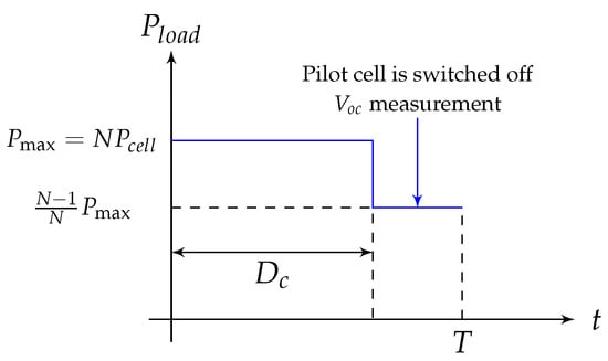 The main purpose of the proposed semi-pilot cell (SPC) FOCV approach is to reduce the power loss in comparison to the conventional FOCV method. The semi-pilot cell is integrated into the PV array and delivers power to the load as other PV cells. However, unlike the other cells, the semi-pilot cell can be disconnected from the PV array in order to measure the open-circuit voltage. The semi-pilot cell operation cycle can be divided into two stages. During the first stage (supply period), there are no measurements of the open circuit voltage and the semi-pilot cell supplies power to the load. During the second stage (measurement period), the semi-pilot cell is disconnected from the array, and the open-circuit voltage is measured, as shown in Figure 3. during this stage the semi-pilot cell is bypassed by a switch, which can be implemented by a MOSFET as shown in Figure 4.