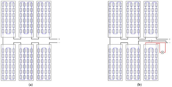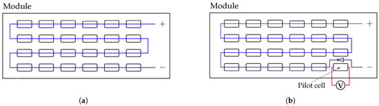 PV panel configuration during one measurement cycle. (a) First stage: all N cells provide power to the load, semi-pilot cell is connected to the array; (b) Second stage: semi-pilot cell is disconnected from the array.