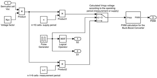 The control unit presented in Figure 7. The main objectives of the control unit are switches operation, calculation of the voltage according to the corresponding period and PWM signal generation for the Buck-Boost converter. The input of the control unit is measured open circuit voltage of the semi-pilot cell while the outputs are switching signals (S1, S2) for the switches and PWM signal for the Buck-Boost converter.