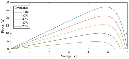 The graph of the simulated PV array’s output power vs. output voltage for constant cells temperature of 25 °C and different irradiance values is shown in Figure 8. The output power vs. output voltage curves are obtained by the simulation circuit shown in Figure 9 where the irradiance of the PV array is changed according to the desired curve i.e., 100%, 80%, etc. The simulated PV array consists of ten series connected cells (the parameters of the cells are shown in Table 2) and feeds the load that is implemented by varying voltage source that is swept between zero to the value (6 V) of the array’s open circuit voltage.