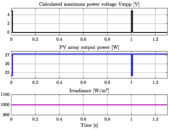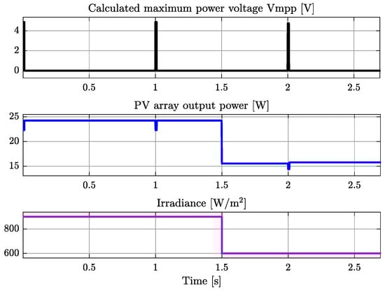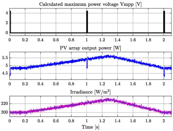 The third case presents the sudden drop in the irradiance from 900 to 600 W/m2, as shown in Figure 12. In this example, the first two measuring periods corresponding to 0–0.01 s and 1–1.01 s are performed under the same irradiance of 900 W/m2. Therefore, the same open circuit voltage of 0.596 V is measured on the semi-pilot. During these measuring periods, the DC-DC converter is set to the V. After these measurement periods begin supply periods that take place between 0.01–1 s and 1.01–2 s. The corresponding DC-DC converter’s voltage is calculated by V. Although there is change of irradiance in the middle of the second supply period (at 1.5 s) from 900 to 600 W/m2, the DC-DC converter will stay tuned to the 4.86 V voltage which is not the maximal power voltage for the irradiance of 600 W/m2. As a result, the output power of the PV array will be 15.7 W instead of maximal 15.78 W. The difference between the maximal and obtained powers is only 0.08 W (0.5%) because voltage is almost uninfluenced by the irradiance variations unlike the current which is significantly effected by the irradiance changes, see Figure 8. This small mismatch can be further reduced by increasing the frequency of the operation cycle according to the irradiance conditions. During the third measurement period (2–2.01 s), the measured open circuit voltage of the semi-pilot is 0.58 V that corresponds to the V. After the third measurement period, in the following supply periods, the DC-DC converter is operated with V which is updated to the irradiance of 600 W/m2 and the output power of the PV array is increased to 15.78 W. These simulations show that the proposed SPC-FOCV method is accurate for constant and varying irradiance conditions.