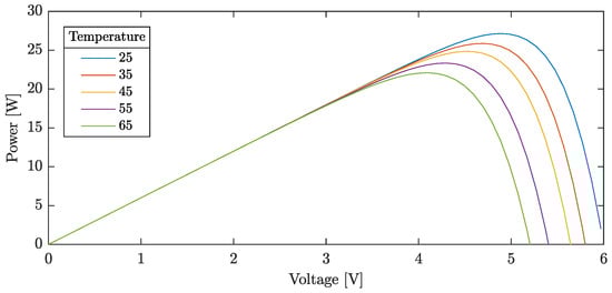 Other set of simulations was performed for temperature variations between 25 °C to 65 °C while the irradiance was kept constant at 1000 W/m2 (the nominal temperature of the simulated panel is 25 °C). The graph of the simulated PV output power vs. output voltage curves for different temperature values is shown in Figure 13. This graph can be used in order to measure the value of the PV array’s voltage for each specific temperature. These curves were obtained by using simulation setup shown in Figure 9 where the temperature of the PV array was changed according to the desired curve. It can be seen that the temperature variations significantly effect the open-circuit voltage which is reduced when the temperature is increased. The calculated voltage factor for different temperature values is shown in Table 7.
