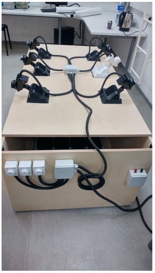 To experimentally verify the operation of the proposed SPP-FOCV method, a special box was constructed, see Figure 15. The purpose of this box is to set the desired irradiance values for each PV panel and to eliminate the effect of light from outside. Six 500 W lamps were installed on the top of the box. Each pair of lamps is installed above PV panel and equipped with dimmer that allows precise irradiance control. For each experiment, the lamps were tuned to the specific irradiance values that were applied to the PV panels.