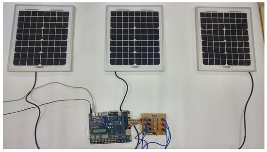 The three tested PS10M-12/B PV panels are connected in series and installed inside the box, under the lamps, as shown in Figure 16. The principle scheme of the experimental setup is shown in Figure 17. It is operated in the same manner as explained in Section 3. Each panel consists of 36 mono-crystal Si solar cells connected in series. The parameters of the panels are shown in Table 9. The calculated voltage factor of these PV panels is 0.8. The third panel is the semi-pilot panel equipped with three Mosfet switches (switches 1, 2 and bypass). The control unit for switches and Buck-Boost converter control is implemented by Altera DE2. The switches are implemented by CSD19531KCS Mosfets. The open circuit voltage of the semi-pilot panel is measured by the voltage sensor and its value is transfered to the Altera. The accuracy of the voltage sensor used in the experimental setup is ±5 mV. The PV array’s output power is measured by the GPM-8212 multi-meter whose accuracy is ±0.2% of reading.
