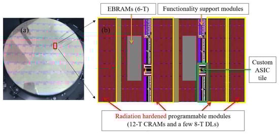 The picture of the developed device in the 8-inch wafer is shown in Figure 1a and the whole view of chip’s layout is shown in Figure 1b. The DUT contained 600 programmable I/O blocks located in banks. The ∼20 Mbit CRAM were used to control the routes and switch boxes. The ∼8 Mbit embedded block memories were organized and distributed in DUT. Besides, The ∼170 Kbit Debugging Logics (DLs) in circuits were also included to test the actual function of devices by capturing read back signals. Apart from the different architecture and resource distributions, the most essential improvement in the DUT is the combined usage of 8-T and DICE structures in the layout design (programmable modules in Figure 1b).