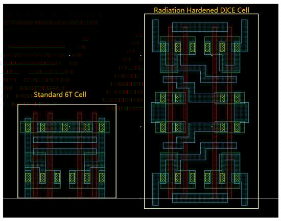 Layout comparison of the DICE hardened cell and standard 6-T cell.