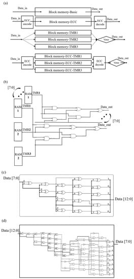 Configured EBRAM: (a) the four types of EBRAM; (b) the generated 8-channel TMR circuits; (c) the generated ECC encode circuits in FPGA; and (d) the generated ECC decode circuits in FPGA.