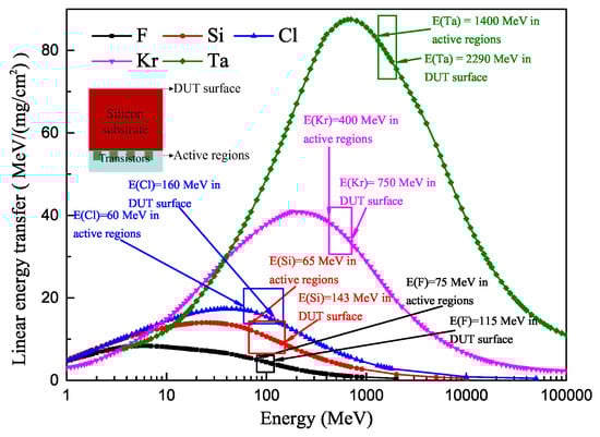 Heavy ion tests were completed at Heavy Ion Research Facility in Lanzhou (HIRFL) in the Institute of Modern Physics, Chinese Academy of Sciences, and HI-13 Tandem accelerator, China Institute of Atomic Energy. At HIRFL, the tests were carried out in air; and at HI-13 Tandem accelerator, the DUT was located in a vacuum chamber. The type of heavy ions applied for the tests are detailed in Figure 5. To realize a superior accuracy control in LET, for each type of ion, only one energy in high energy region was selected (in the right side of Bragg peak). For each type of heavy ion, its initial energy in DUT surface and the energy in the active layer of DUT (after passing through the thick silicon substrate) are marked in Figure 5. In this study, the LET values in data analysis were all calculated using the ion energy in the active layer.