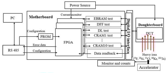 The DUT was installed on a daughterboard and controlled by a FPGA-based motherboard via digital I/O interface (as shown in Figure 6). The tested resources in DUT, the data configuration, the error data distinction and the communication with Personal Computer (PC) were all completed by the FPGA in the motherboard. During heavy ion irradiation, the upsets (errors) in EBRAM, CRAM, DL and DFF were analyzed automatically by configured FPGA logic and then the error information including the detail of address were recorded and presented on the screen of PC. Besides, the currents in the testing system were monitored and recorded to judge whether there was a latch-up.