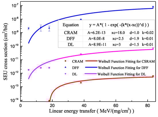 where (cm/bit) indicates the SEU cross-section, (cm/bit) indicates the saturation upset cross-section, represents the threshold of LET to observe upset errors, s means a dimensionless exponent, and w is a width parameter, as shown in Figure 7. Weibull function is widely used to describe the direct ionization caused by heavy ions, providing great agreement in fitting cross-section thresholds, plateau or limit values. The saturated cross section in EBRAM, DFF, CRAM and DL were 6.2 × (cm/bit), 8.3 × (cm/bit), 6.5 × (cm/bit), and 8.9 × (cm/bit), respectively, for the diverse layout hardening.