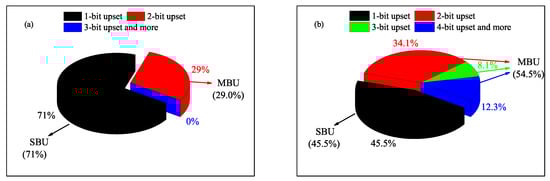 Additionally, layout hardening declined the Multiple Bits Upset (MBU) significantly. As shown in Figure 8a, Single Bit Upset (SBU) takes high proportion in DICE hardened CRAM. Three-bit or more upsets did not appear during the whole irradiation test. However, in 6-T cell, MBU accounted for a large proportion (54.5%) and four-bit or even five-bit upsets in the unhardened cells were more than 10% (Figure 8b).
