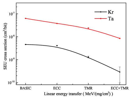 Three hardening techniques, namely 8 + 5 ECC codes, TMR and ECC codes plus TMR, were used to evaluate the effectiveness of soft error mitigation. As shown in Figure 9,the ECC codes plus TMR had the lowest upset rates. Even in Ta irradiation, the cross section was just 8.5 × (cm/bit), declined ∼86.3% when compared with the unhardened one. Merely ECC or TMR method in EBRAM played a minor role in upset error correction, although they were area and resources consuming. The results matched the high MBU rates in basic 6-T cells presented in Figure 8, leading the separated fault tolerance method (ECC or TMR) becoming invalid.