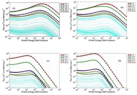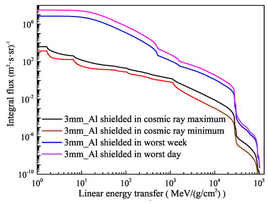 In near-Earth interplanetary or GEO orbit, heavy ions in cosmic ray and solar ray dominate the total SEU rates by direct ionization to produce carriers in the vicinity of transistors’ sensitive regions and then lead to SEU phenomenon. The SEU rates induced by heavy-ion direct ionization in space can be calculated by Creme 96 HUP tool []. The flux vs. kinetic energy curves of variety of particles under four different radiation environments in GEO were achieved, as shown in Figure 10, through the Creme 96 HUP tool. Then, we obtained the flux distribution vs. (Figure 11) with 3 mm aluminum shielding, which is normal for space application. For the calculation of SEU probability ( (/bit/day)), we used P (/MeV) to characterize the probability. If the deposited ionization energy of a particle through the track was higher than the energy threshold (/MeV) of upset, then an upset was considered to have occurred. For an incident ion, the probability to get an upset is [,,]: