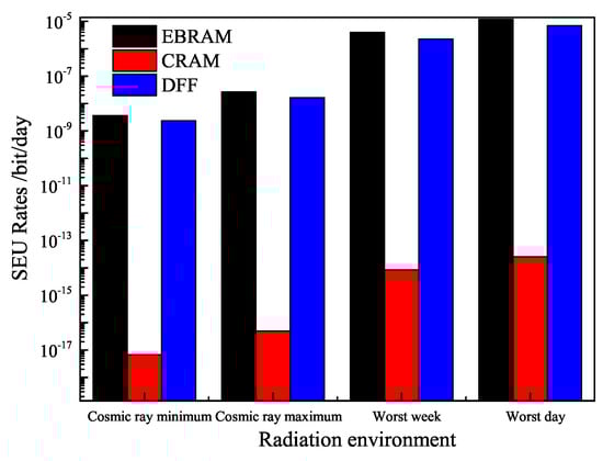 The SEU rates were calculated and normalized to per bit per day by Creme tools. As shown in Figure 12, CRAM had strong radiation tolerance (8.46 × /day/bit) in worst week, even in extremely cruel radiation environments. EBRAM and DFF had upset rates of ∼/bit/day in cosmic ray minimum and maximum periods. Although the rate was many orders of magnitude higher than CRAM, it was still a quite low rate when compared with the results in [,]. The calculation results reveal that, even in worst-week radiation condition, only several errors occurred per day per device for EBRAM and lower errors in DFF.